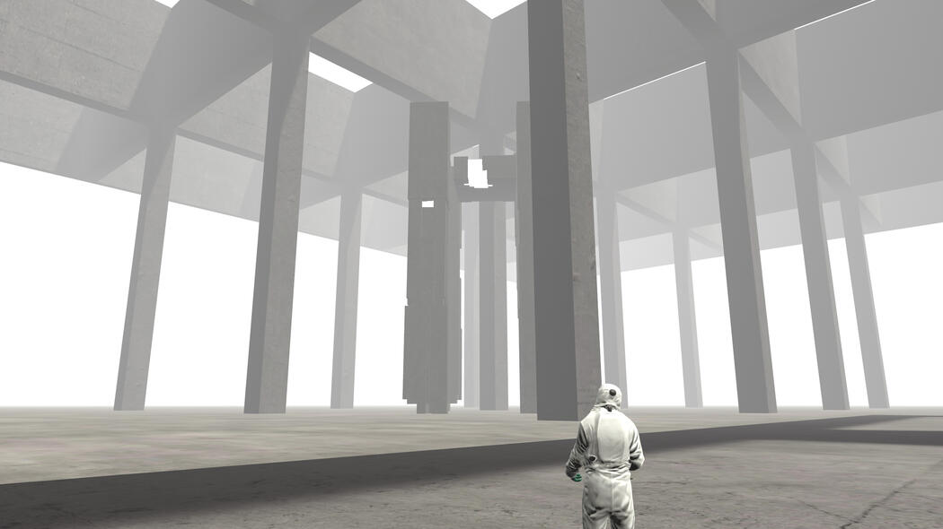E-34 is a concrete baseplate with 9 pillars in the middle and roofs with square holes in all 4 corners of the instance