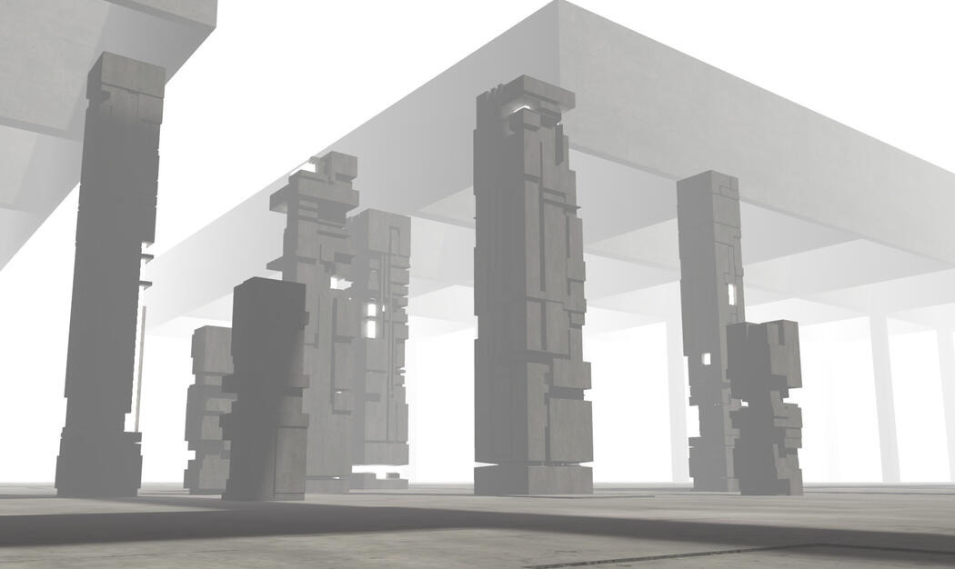 E-34 is a concrete baseplate with 9 pillars in the middle and roofs with square holes in all 4 corners of the instance